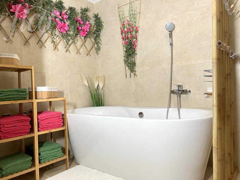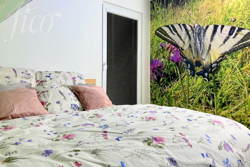 1. patro: chodba, koupelna se sprchovým koutem, umyvadlem a WC, 3x pokoj, všechny pokoje jsou neprůchozí: největší pokoj s balkonem k lesu, 2x dvojlůžko, 1x jednolůžko, prostorná skříň, menší pokoj 1x dvojlůžko, skříň, další pokoj 1x dvojlůžko, skříň, postýlka. Má samostatný vchod na prostornou terasu (40 m2) s masivní houpačkou a lehátky.