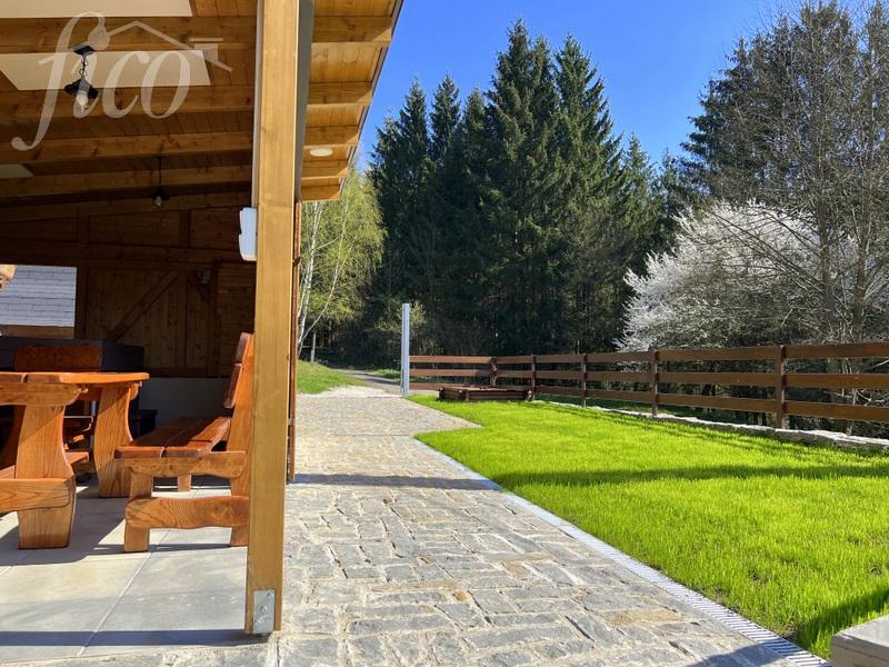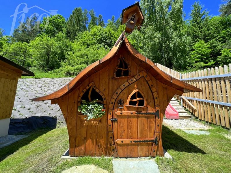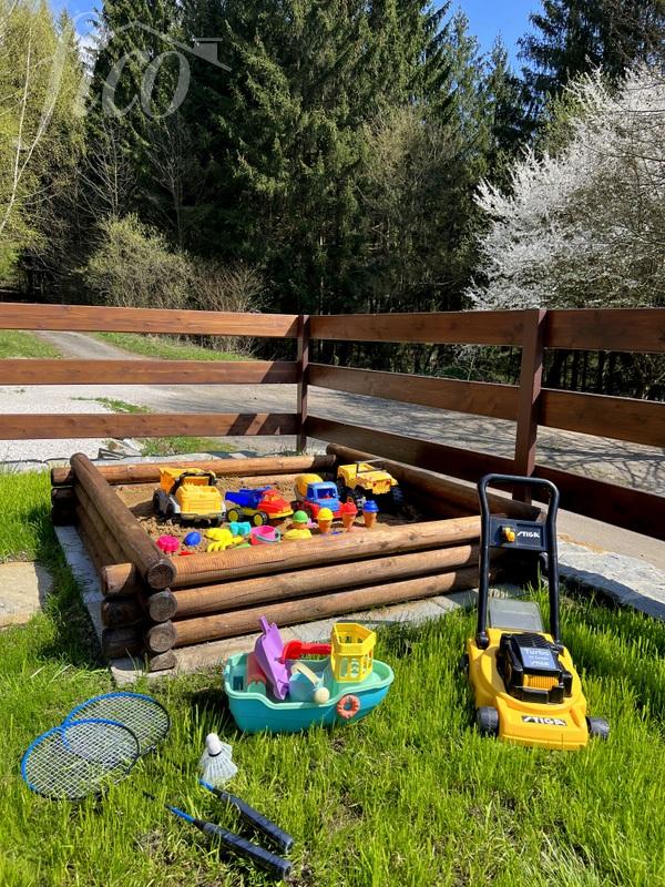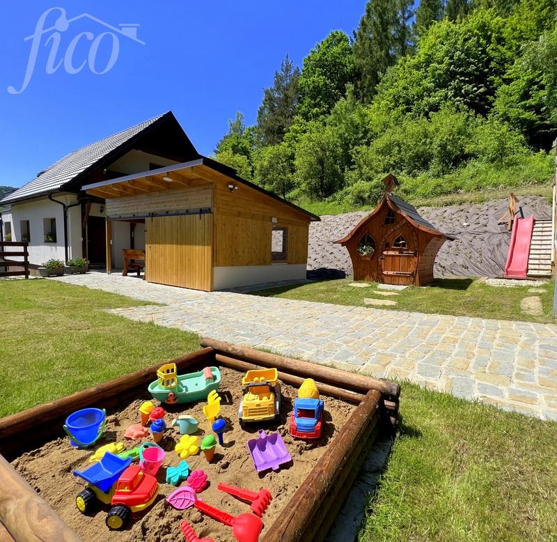 Samozřejmostí je WIFI připojení v celém prostoru domu i zahrady. Zahrada je uzavřena oplocením s řadou dětských prvků jako skluzavka, pískoviště, dětský domeček Medvídek Pú. Kolem objektu se nachází srovnaný pozemek s udržovaným trávníkem. Na svažitých částek pozemku jsou vysázeny trvanlivé kvetoucí keřové porosty. Příjezd k domu je po veřejné asfaltové komunikaci. Před objektem se nachází 4 parkovací místa. Další 2 je možno využít na vlastním pozemku.