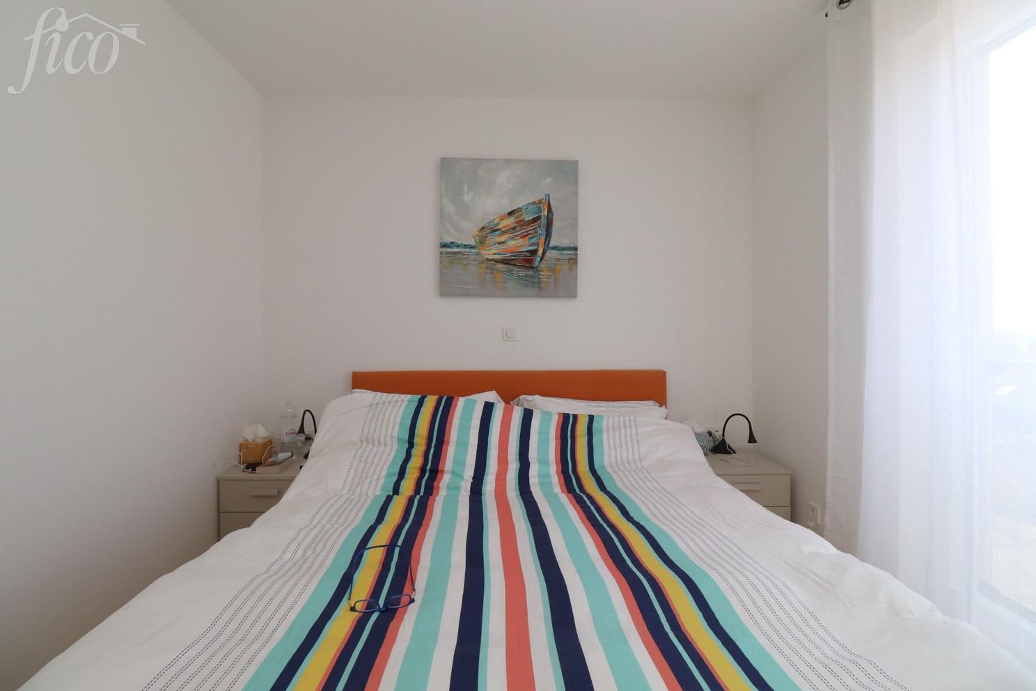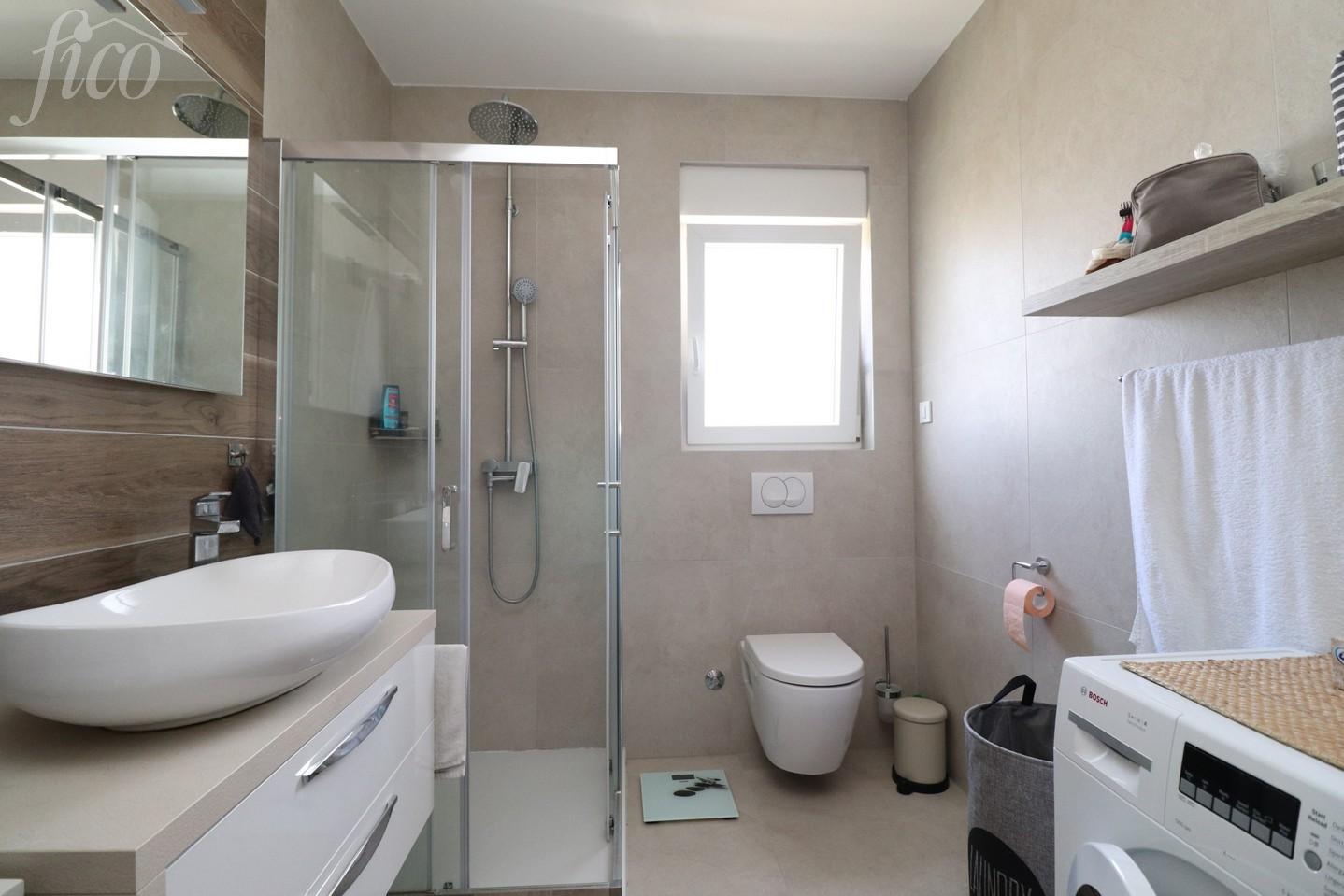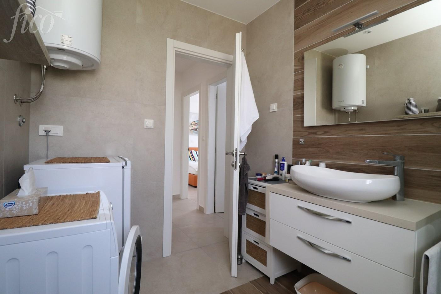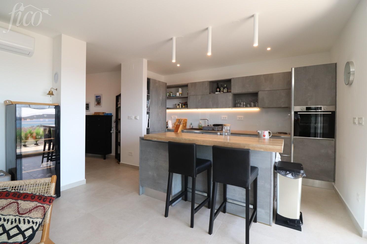 Zařízený apartmán se 2 ložnicemi a panoramatickým výhledem na moře ve Vodici. Byt nabízí 85,39 m² užitné plochy a nachází se ve 2. patře moderního bytového domu. Je orientován na jihozápad a skládá se ze vstupní haly, chodby, toalety pro hosty, koupelny, dvou ložnic a prostorné kuchyně s obývacím pokojem, který se otevírá na velkou krytou terasu s panoramatickým výhledem na moře. Terasa měří 16,63 m² a je vybavena slunečníky. V bytě je podlahové vytápění v obývacím pokoji a koupelnách, klimatizace ve všech pokojích a elektrické rolety. Je kompletně zařízen nábytkem, kuchyně je na míru a plně vybavena. K bytu patří jedno parkovací stání. Budova se nachází na klidném místě, pouhých 680 m od pláže a 500 m od centra města. Rok výstavby 2017.
