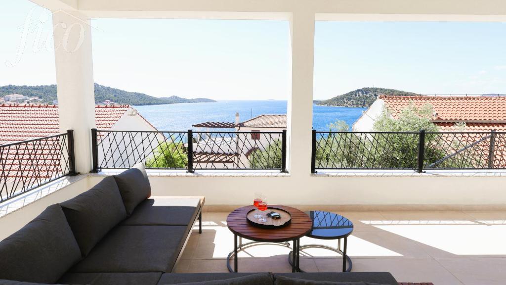 V suterénu je apartmán o výměře 22,17 m2 s možností rozšíření o dalších 15 m2 a lze jej přestavět na vinný sklep, posilovnu nebo wellness, případně i na další bytovou jednotku. V přízemí se nachází jeden jednopodlažní a jeden dvoupatrový apartmán. Jednopatrový apartmán se skládá z kuchyně, jídelny s obývacím pokojem, koupelny a ložnice. Obytná část se otevírá na terasu s výhledem na moře. Plocha tohoto apartmánu je 57 m2. Mezonetový apartmán má celkovou plochu 156 m2 a skládá se z kuchyně s jídelnou, obývacího pokoje, dvou koupelen, vnitřního schodiště, dvou ložnic a dvou teras s výhledem na moře.V prvním patře se nachází další apartmán o rozloze 68 m2, který se skládá z jedné ložnice, koupelny, obývacího pokoje, kuchyně s jídelnou a terasy. Ve druhém patře se nachází relaxační místnost s posilovnou, která vede na prostornou terasu s otevřeným a neomezeným výhledem na otevřené moře, město Rogoznica a Rogoznický záliv.