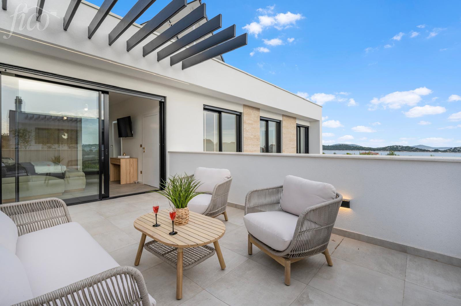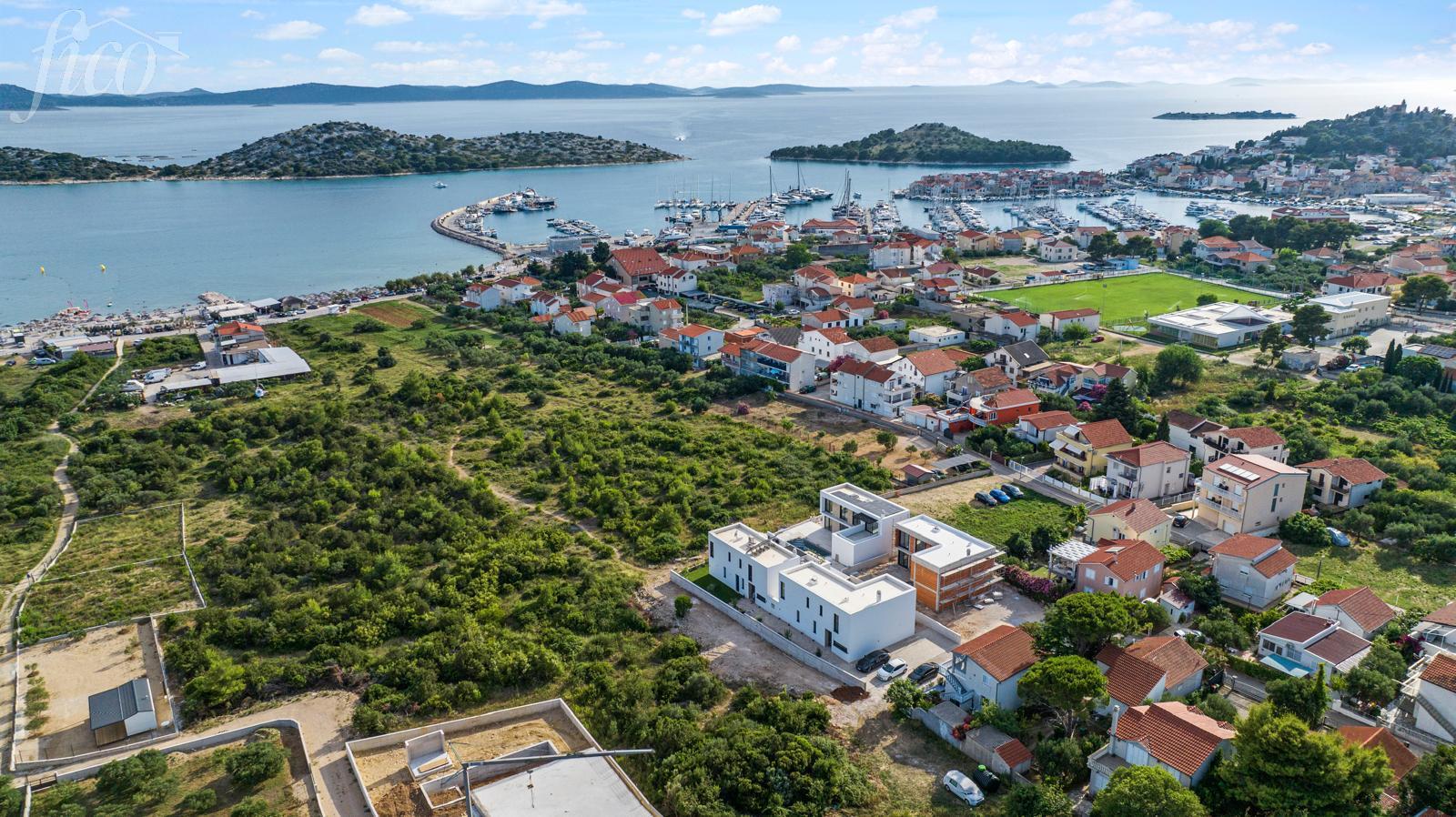 Luxusní nově postavený dům s výhledem na moře, v klidné a atraktivní lokalitě v Tribunji. Je navržená pro maximální komfort bydlení. Dům se rozkládá na dvou podlažích - přízemí + první patro s celkovou užitnou plochou 150 m², s upravenou oplocenou zahradou o rozloze 150 m2. Exteriér doplňuje velká terasa, bazén a dvě parkovací místa. V přízemí se nachází vstupní hala, koupelna, toaleta s prádelnou, jedna ložnice a prostorná kuchyň s jídelnou a obývacím pokojem, ze které je vstup na krásnou terasu a dvůr s bazénem. Tento prostor je navržen jako centrum pro rodinné setkávání a zábavu. V prvním patře se nacházejí dvě ložnice - obě s vlastní koupelnou a velká nekrytá terasa s výhledem na moře. Dům je postaven a vybaven podle vysokých standardů kvality a moderního designu. Nachází se v klidném prostředí a zároveň v ideální vzdálenosti od veškeré občanské vybavenosti: pouhých 600 m od pláže a 650 m od centra města. Dům byl postaven v roce 2025, je kompletně vybaven designovým nábytkem.