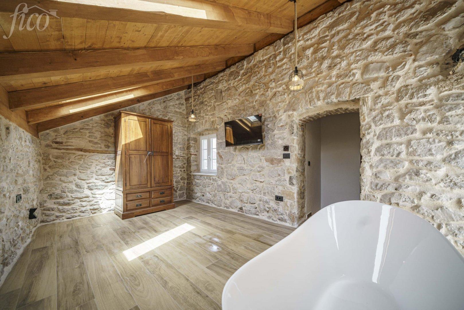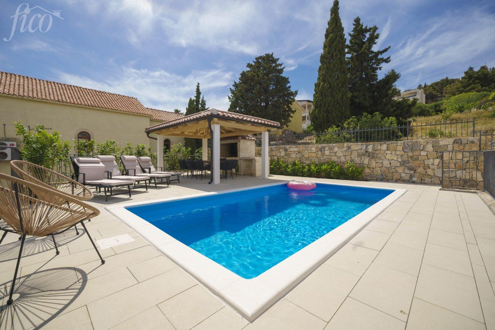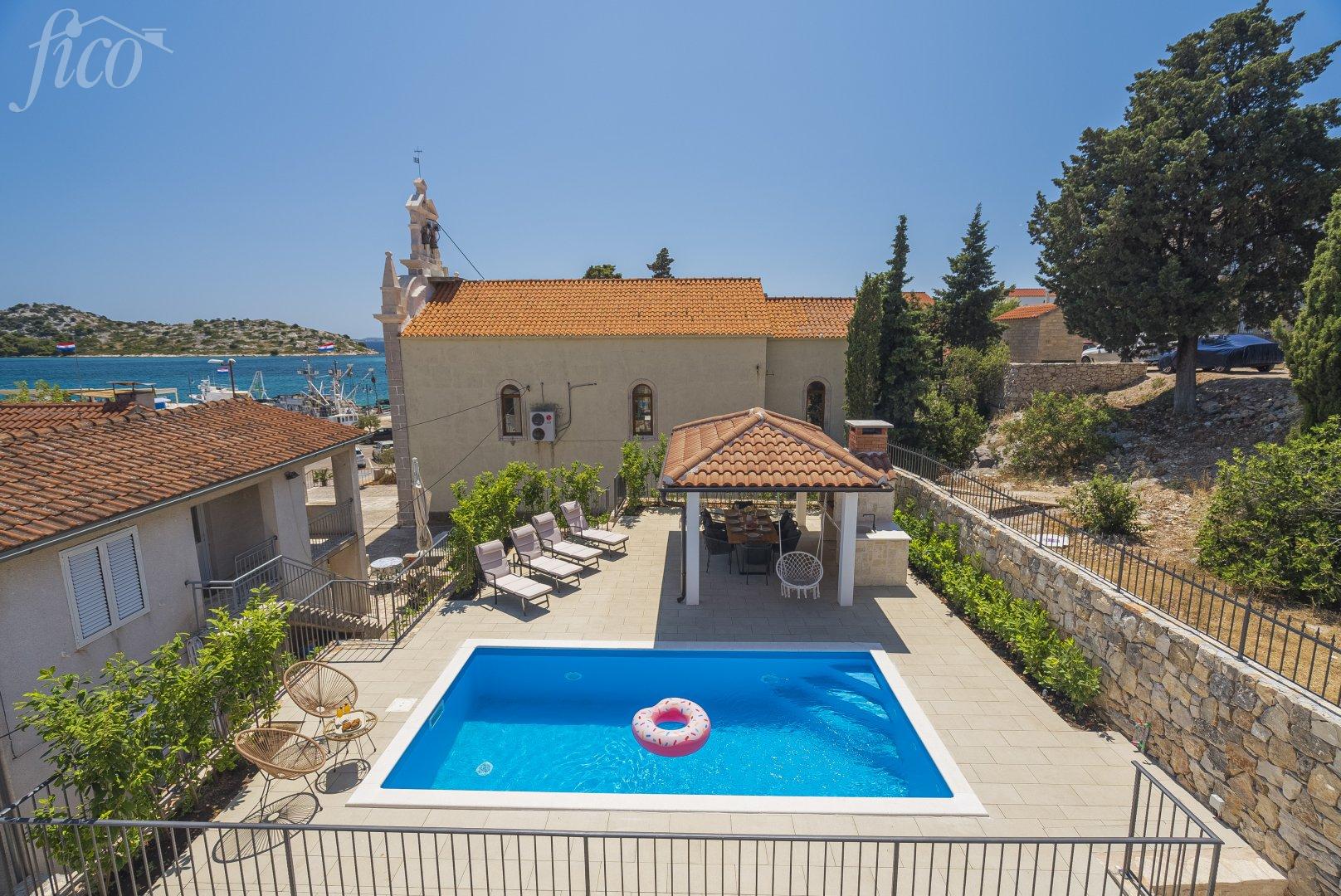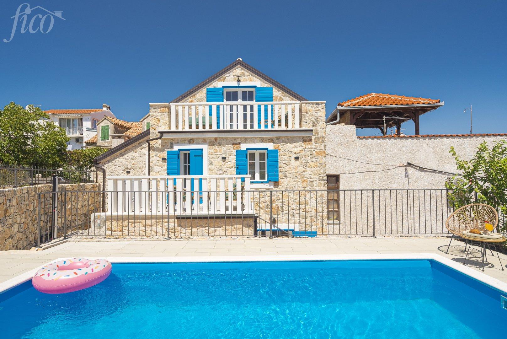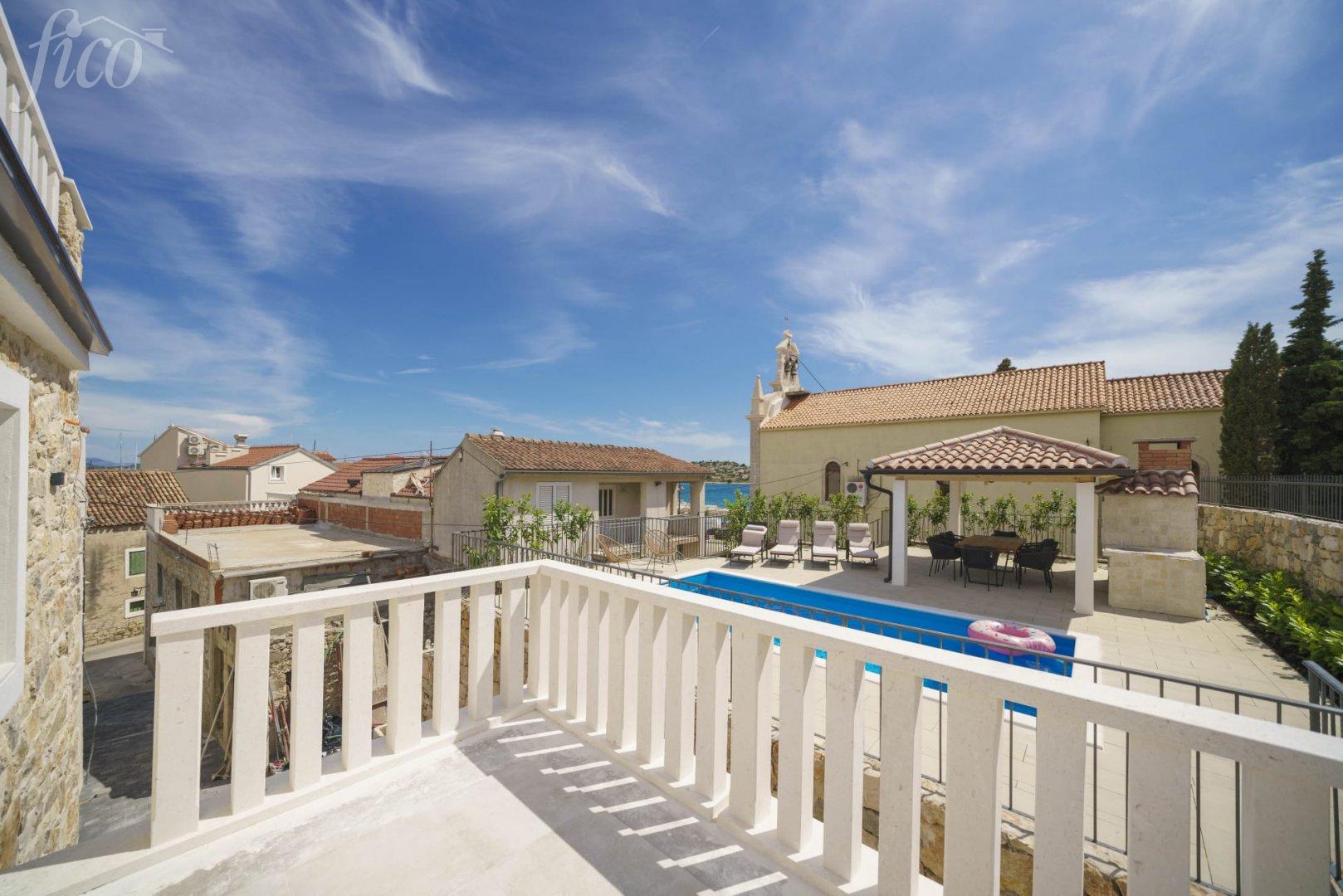 Nádherný, autentický samostatně stojící kamenný dům se zahradou, bazénem a výhledem na moře v centru Tribunje. Dům je třípatrový s celkovou užitnou plochou 137,91 m². V roce 2024 byl kompletně zrekonstruovaný v dalmatském stylu s použitím vysoce kvalitního vybavení a nábytku. Přízemí se skládá z kuchyně, obývacího pokoje, jídelny s vnitřním krbem/grilem a vinným sklepem, toalety a úložné místnosti. Vnitřní schodiště vede do prvního patra, kde se nachází chodba, koupelna a dvě ložnice, přičemž každá ložnice má vlastní terasu. V podkroví se nachází prostorná ložnice s koupelnou a terasou s výhledem na dvůr, bazén a moře. Plocha pozemku je 438 m2 a dvůr je kompletně oplocený a upravený s parkovacím místem a velkou plochou na opalování kolem bazénu a krásným přístřeškem s venkovním grilem. Nábytek je kompletně zahrnut v ceně.