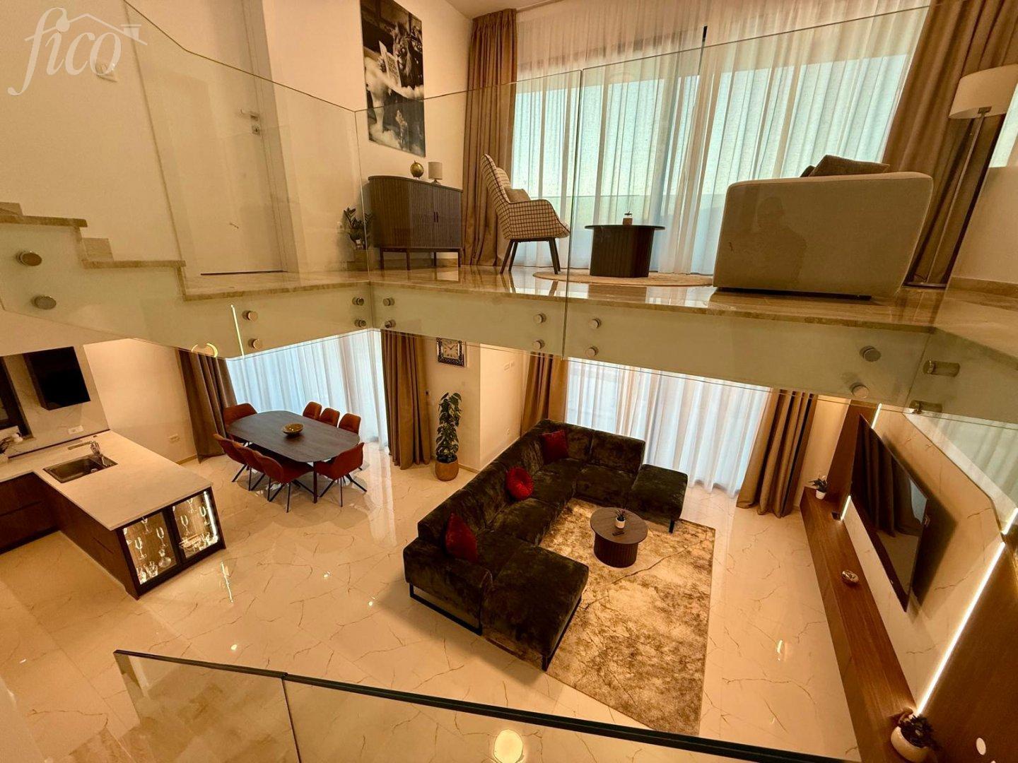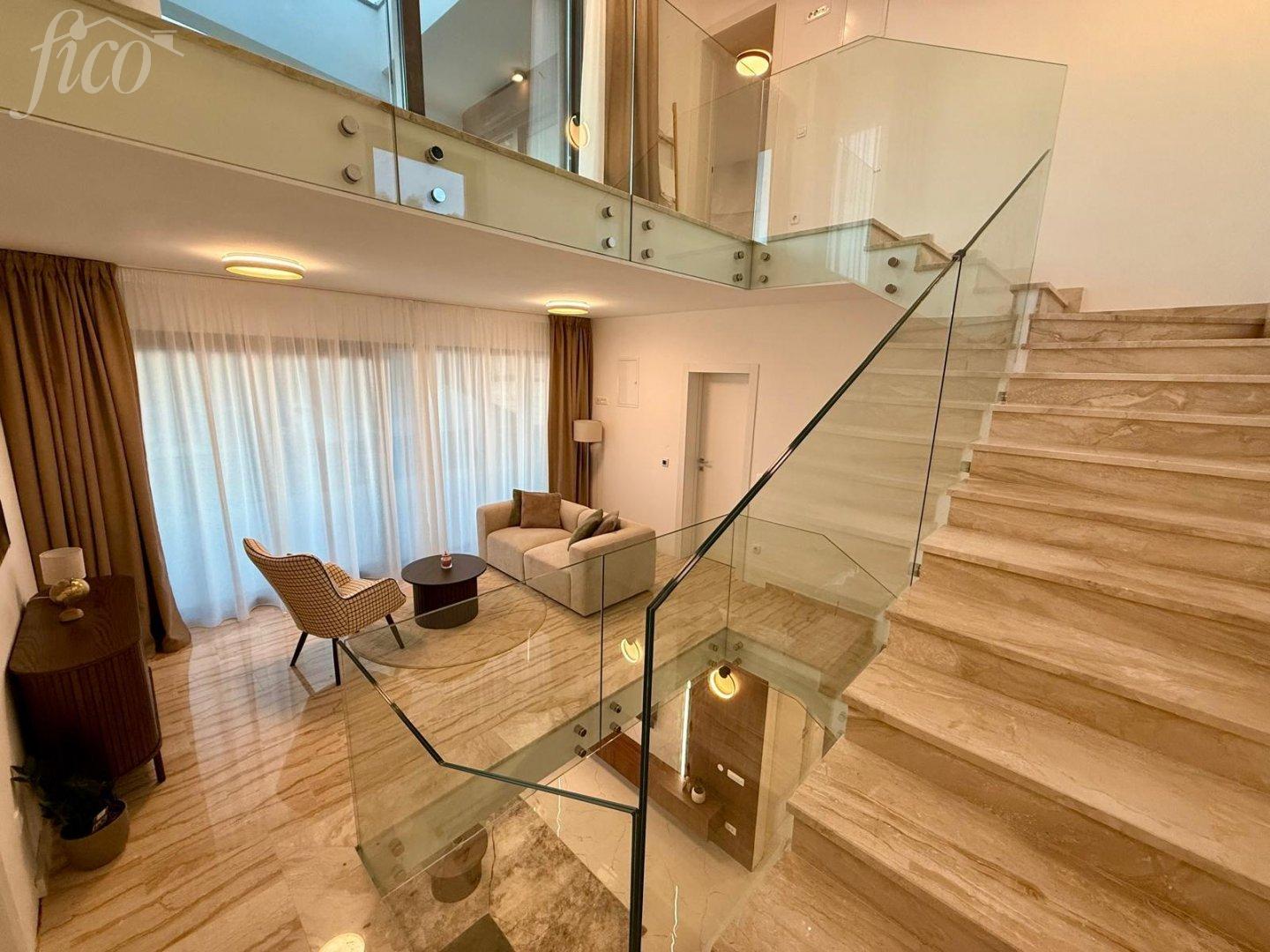 Zvláštním prvkem interiéru je galerie s „levitujícím“ nerezovým schodištěm vedoucím až do druhého patra, přičemž na každém podlaží galerie jsou velké posuvné skleněné dveře. V prvním patře se nacházejí dvě ložnice s vlastní koupelnou (en suite) a dlouhou terasou, dále galerie, kterou lze využít jako posilovnu nebo knihovnu, s velkými skleněnými dveřmi. Ve druhém patře je hlavní ložnice s velkou terasou a vířivkou na střeše, odkud si lze užívat nádherné výhledy. Každé patro má maximální výšku stropu 3 metry, což ještě zvyšuje luxus této jedinečné vily.