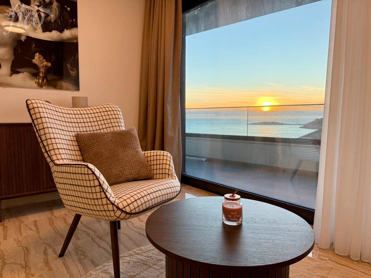 Vstup na pozemek je ze severní strany, nad úrovní přízemí, odkud se k hlavnímu vchodu schází po několika schodech z parkoviště. V přízemí se nachází toaleta, skladovací místnost, prostorný obývací pokoj s kuchyní a velká terasa s úžasným infinity bazénem, letní kuchyní a venkovní jídelní částí. Umístění pohovky i jídelního stolu umožňuje přes velké posuvné skleněné dveře vychutnávat nádherný výhled na moře. Infinity bazén ve tvaru U má část s vířivkou a masážními tryskami a je umístěn na stejné úrovni jako přízemí.