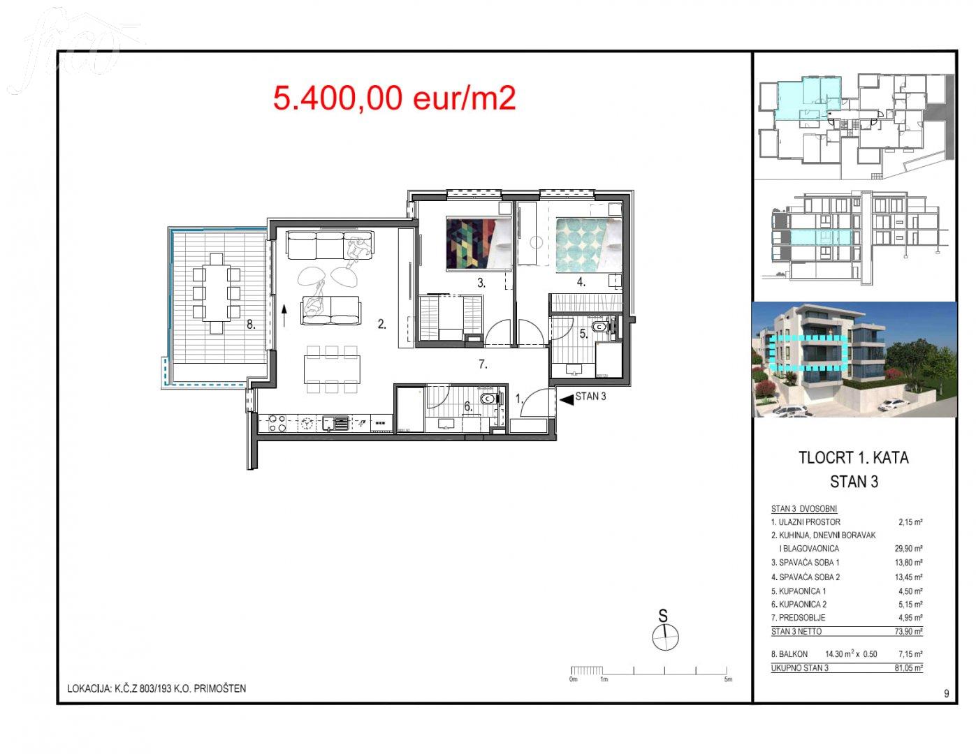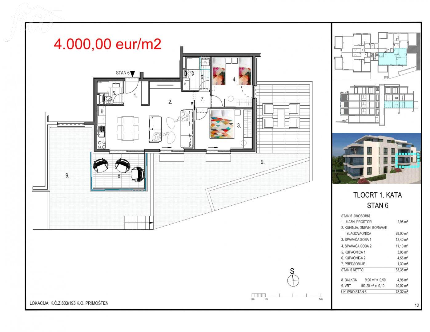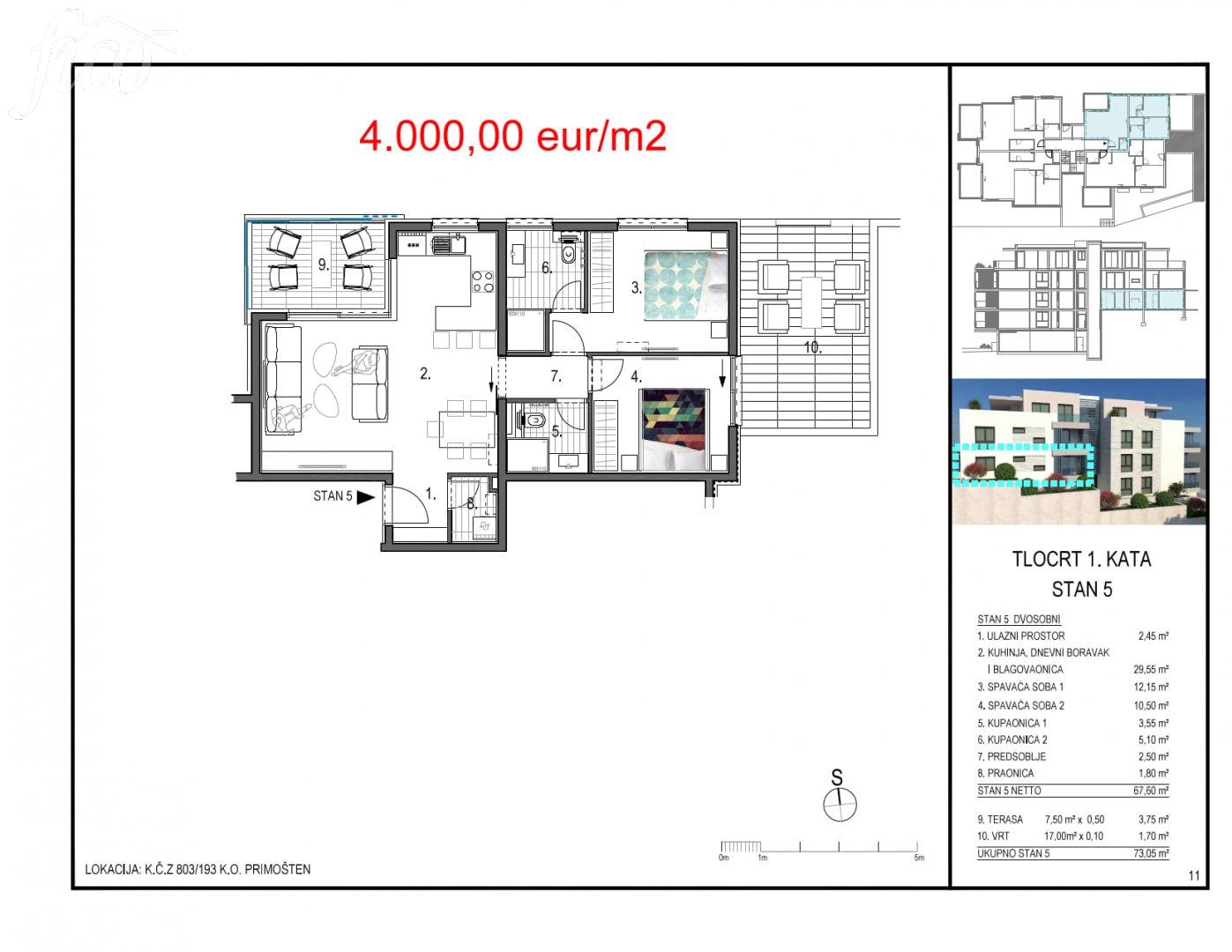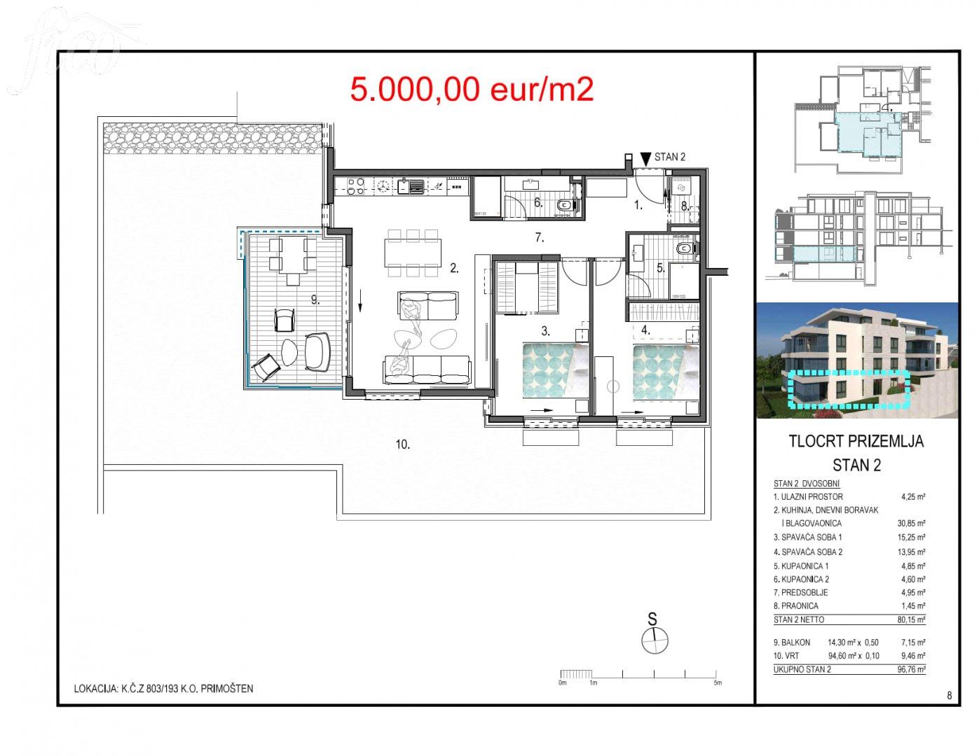 Nabízíme k prodeji exkluzivní novostavbu apartmánového domu v atraktivní lokalitě Primošten, jedné z nejžádanějších destinací na chorvatském pobřeží. Projekt zahrnuje celkem 12 moderních dvoupokojových apartmánů s promyšlenými dispozicemi, důrazem na komfort a kvalitní provedení. Dispozice: 3+kk (dvě ložnice + obývací pokoj s kuchyní), podzemní garáž – 8 parkovacích míst, balkony, terasy nebo soukromé zahrady u vybraných bytů. V posledním patře jsou prostorné apartmány s velkými terasami.