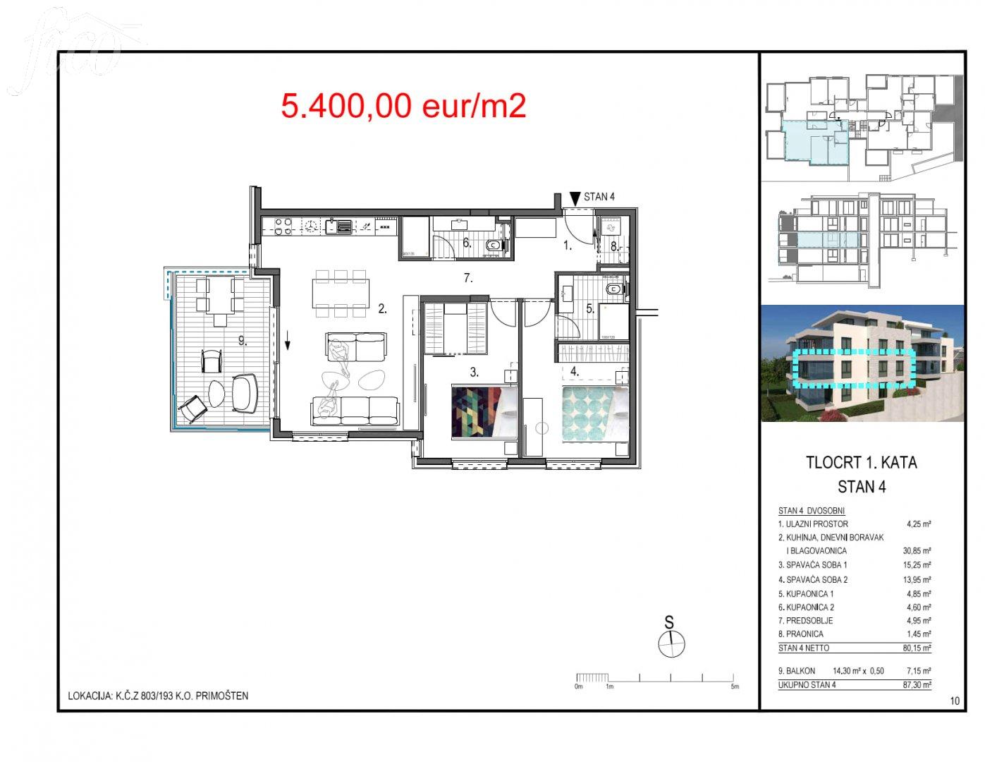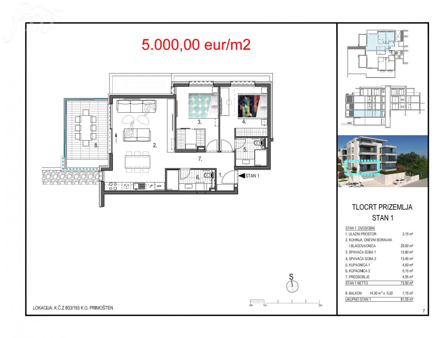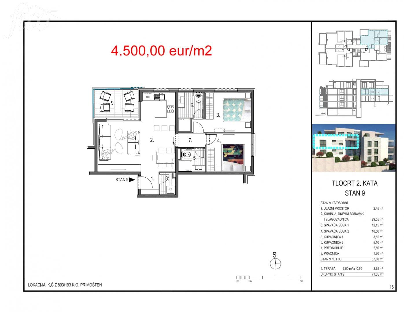 Nabízíme k prodeji exkluzivní novostavbu apartmánového domu v atraktivní lokalitě Primošten, jedné z nejžádanějších destinací na chorvatském pobřeží. Projekt zahrnuje celkem 12 moderních dvoupokojových apartmánů s promyšlenými dispozicemi, důrazem na komfort a kvalitní provedení. Dispozice: 3+kk (dvě ložnice + obývací pokoj s kuchyní), podzemní garáž – 8 parkovacích míst, balkony, terasy nebo soukromé zahrady u vybraných bytů. V posledním patře jsou prostorné apartmány s velkými terasami.