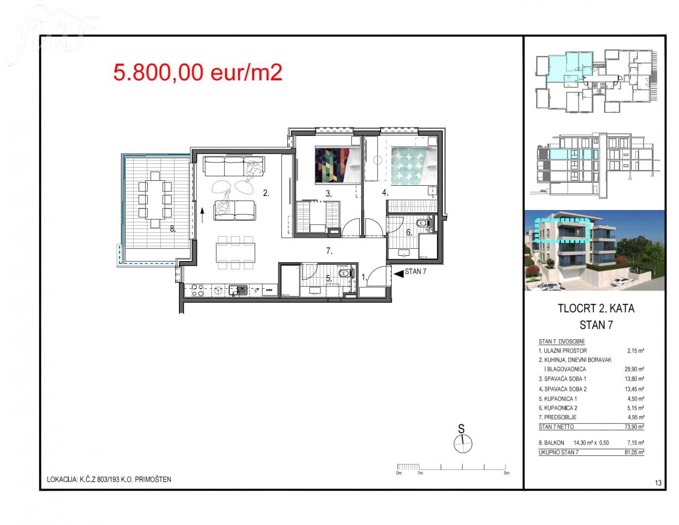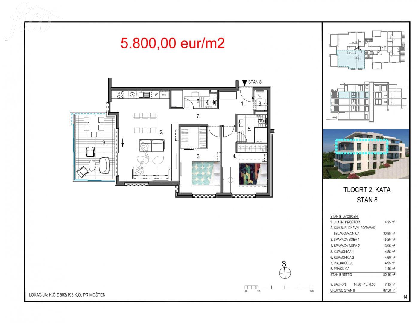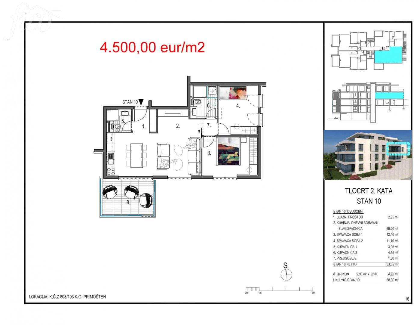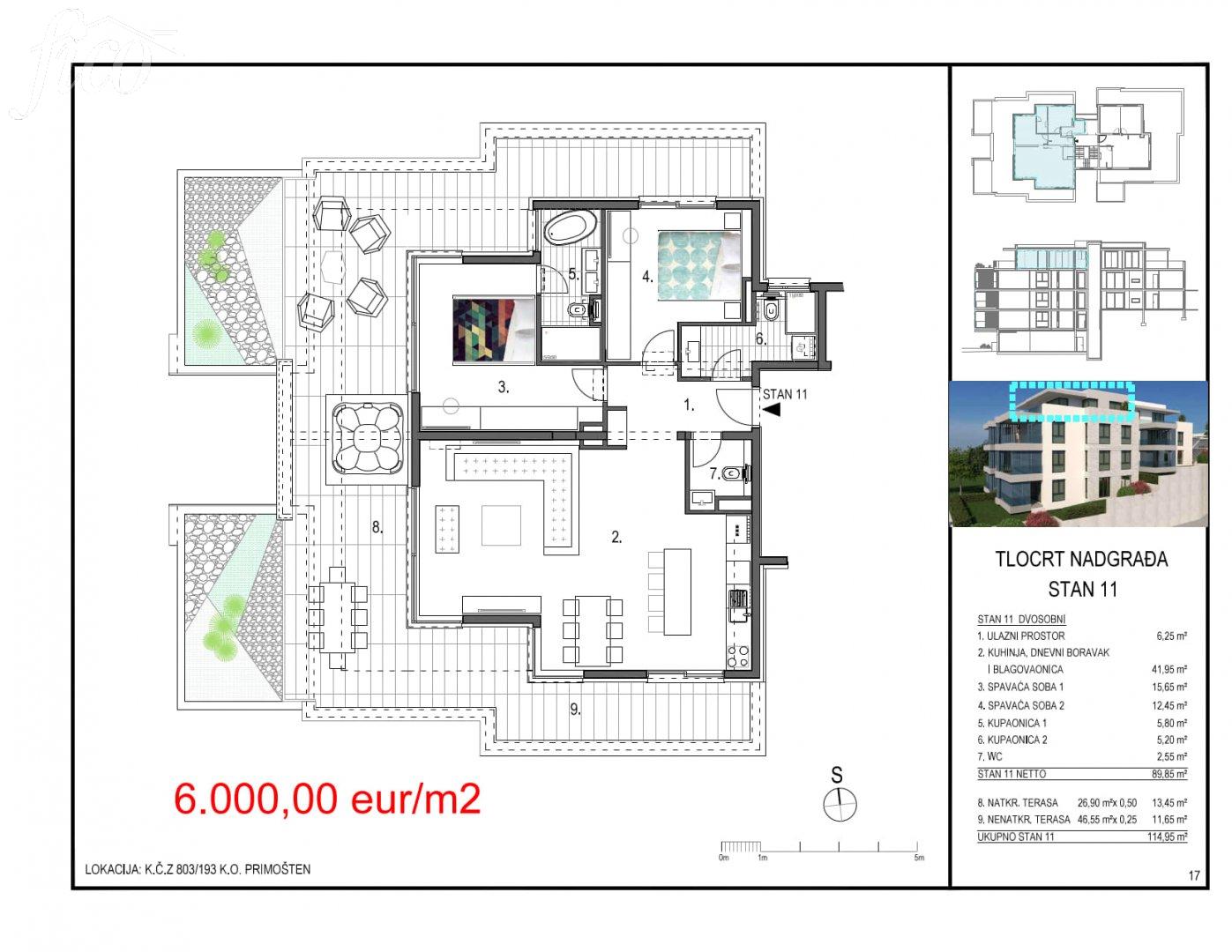 Nabízíme k prodeji exkluzivní novostavbu apartmánového domu v atraktivní lokalitě Primošten, jedné z nejžádanějších destinací na chorvatském pobřeží. Projekt zahrnuje celkem 12 moderních dvoupokojových apartmánů s promyšlenými dispozicemi, důrazem na komfort a kvalitní provedení. Dispozice: 3+kk (dvě ložnice + obývací pokoj s kuchyní), podzemní garáž – 8 parkovacích míst, balkony, terasy nebo soukromé zahrady u vybraných bytů. V posledním patře jsou prostorné apartmány s velkými terasami.
