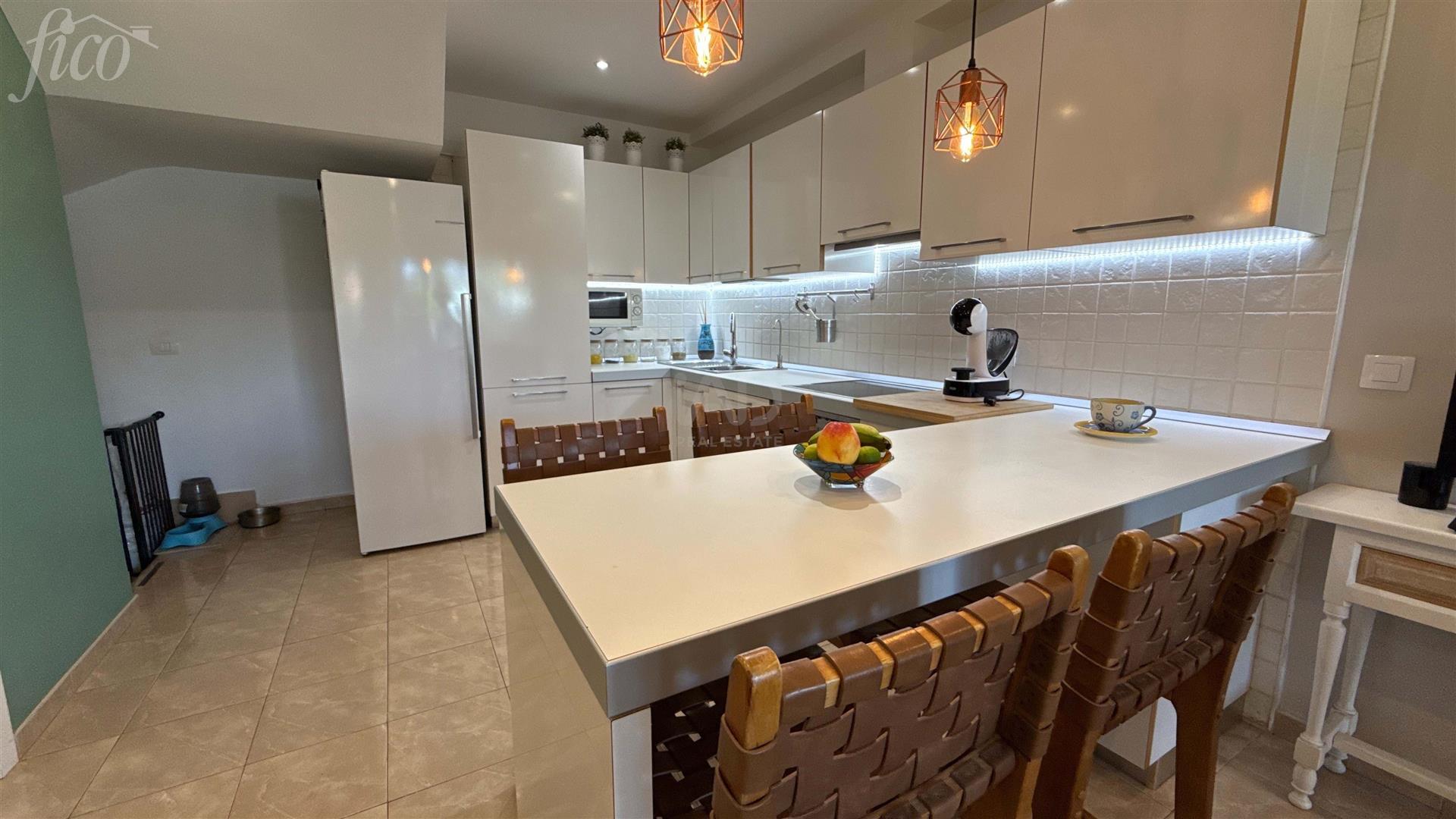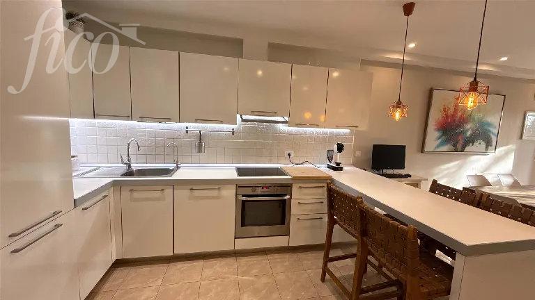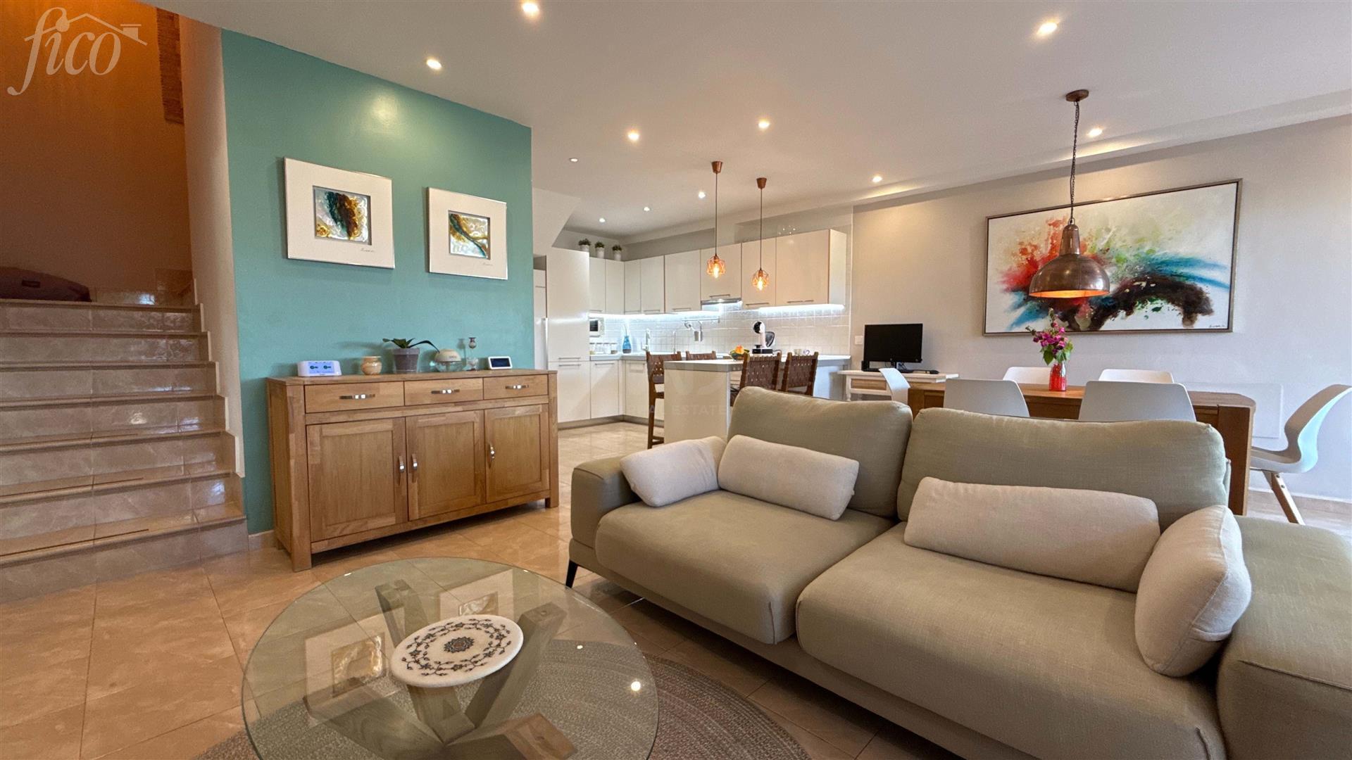 V přízemí se nachází soukromé patio se zahradou a jacuzzi, ideální místo pro relaxaci i posezení s přáteli. Odtud se vstupuje do hlavní obytné části s moderním otevřeným konceptem, kde světlý obývací pokoj plynule navazuje na jídelnu a plně vybavenou kuchyň. Součástí této úrovně je také praktická hostinská toaleta. V patře najdete dvě prostorné a světlé ložnice s vestavěnými skříněmi, každou s vlastní terasou a výhledem na oceán. Komfort bydlení doplňují dvě kompletní koupelny.