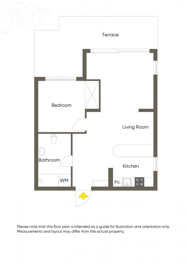 Interiér má otevřenou a vzdušnou dispozici s propojeným obývacím pokojem a kuchyní. Velké posuvné dveře přirozeně propojují vnitřní prostor s terasou a umožňují plynulé přechody mezi interiérem a exteriérem. Apartmán disponuje jednou světlou ložnicí s vestavěnými skříněmi a jednou moderní koupelnou se sprchovým koutem a pračkou.
