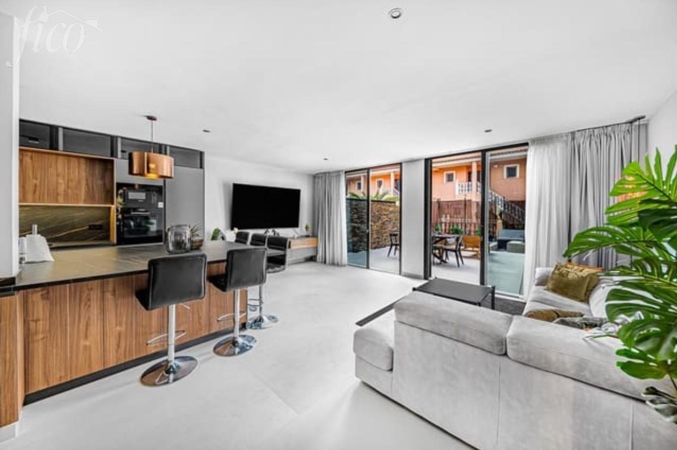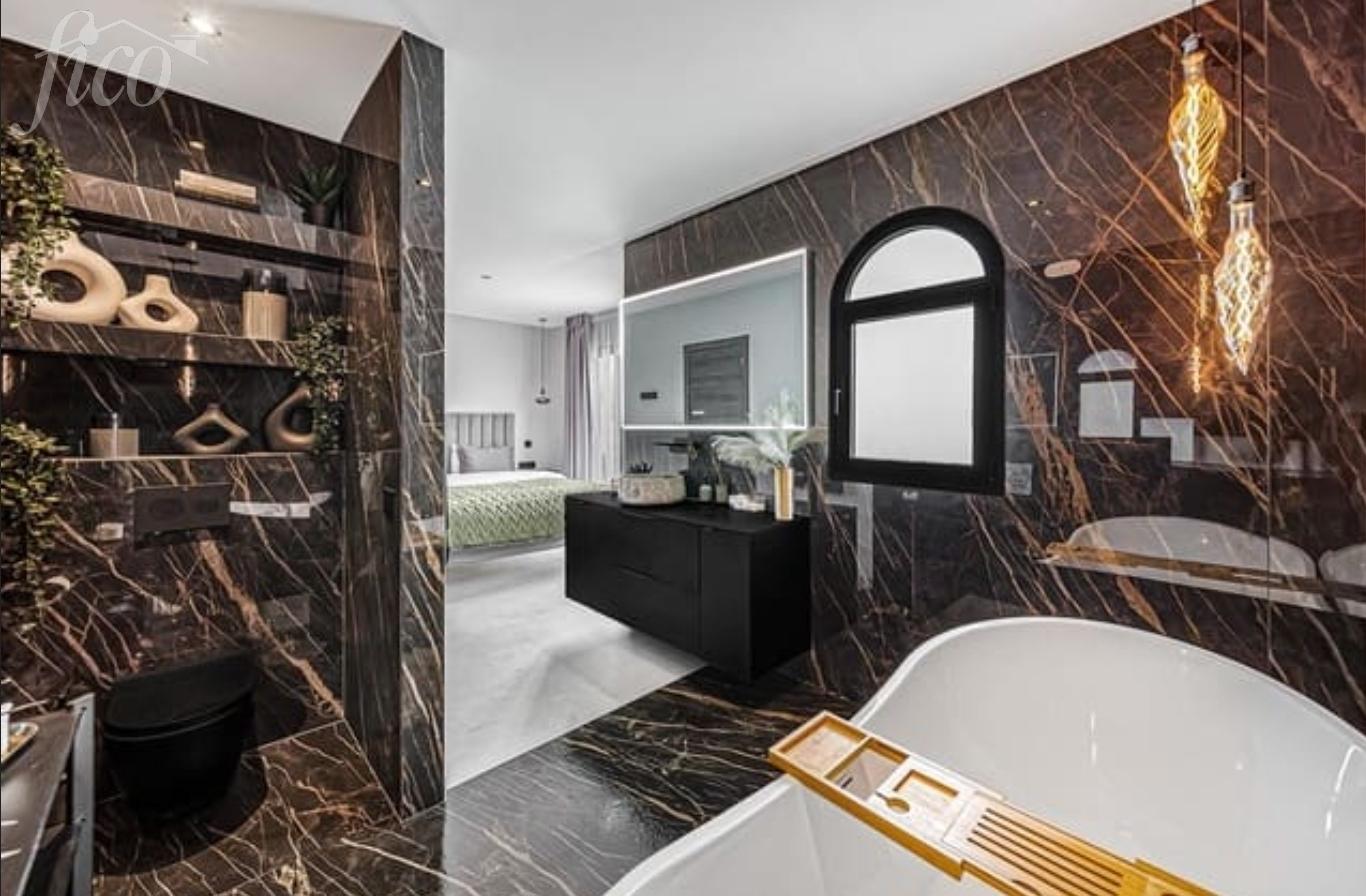 Nabízíme k prodeji exkluzivní designovou řadovou vilu v prestižní lokalitě Playa del Duque, jedné z nejvyhledávanějších adres na jihu Tenerife. Nemovitost se nachází v blízkosti Playa Fañabé a nabízí ideální kombinaci soukromí, komfortu a špičkového designu. Tato jedinečná vila prošla kompletní rekonstrukcí a byla navržena jako moderní rezidence s důrazem na detail, kvalitní materiály a nadčasovou eleganci. Nemovitost o celkové ploše cca 200 m² je rozložena do více podlaží a nabízí promyšlené dispoziční řešení: 4 prostorné ložnice, každá s vlastní koupelnou (en-suite), hlavní ložnice s šatnou a luxusní koupelnou, velkorysý obývací prostor propojený s kuchyní, plně vybavená designová kuchyně se spotřebiči Bosch, druhý obývací pokoj/pracovní zóna. Interiér je sjednocen velkoformátovou dlažbou, doplněnou o prvky z ořechového dřeva, mědi a přírodního mramoru, což vytváří elegantní a harmonické prostředí. Venkovní část je navržena jako plnohodnotné rozšíření obytného prostoru: vyhřívaný soukromý bazén s LED osvětlením, jacuzzi, venkovní sprcha, plně vybavená venkovní kuchyně s grilem, terasa a relaxační zóna s lehátky. Klimatizace ve všech hlavních místnostech, solární panely, soukromá garáž a společné zahrady a komunitní bazén. Costa Adeje patří mezi nejluxusnější oblasti Tenerife s kompletní občanskou vybaveností – restaurace, butiky, pláže i promenády jsou v docházkové vzdálenosti. Výborné napojení na dálnici TF-1 zajišťuje rychlý přístup na letiště i do dalších částí ostrova.