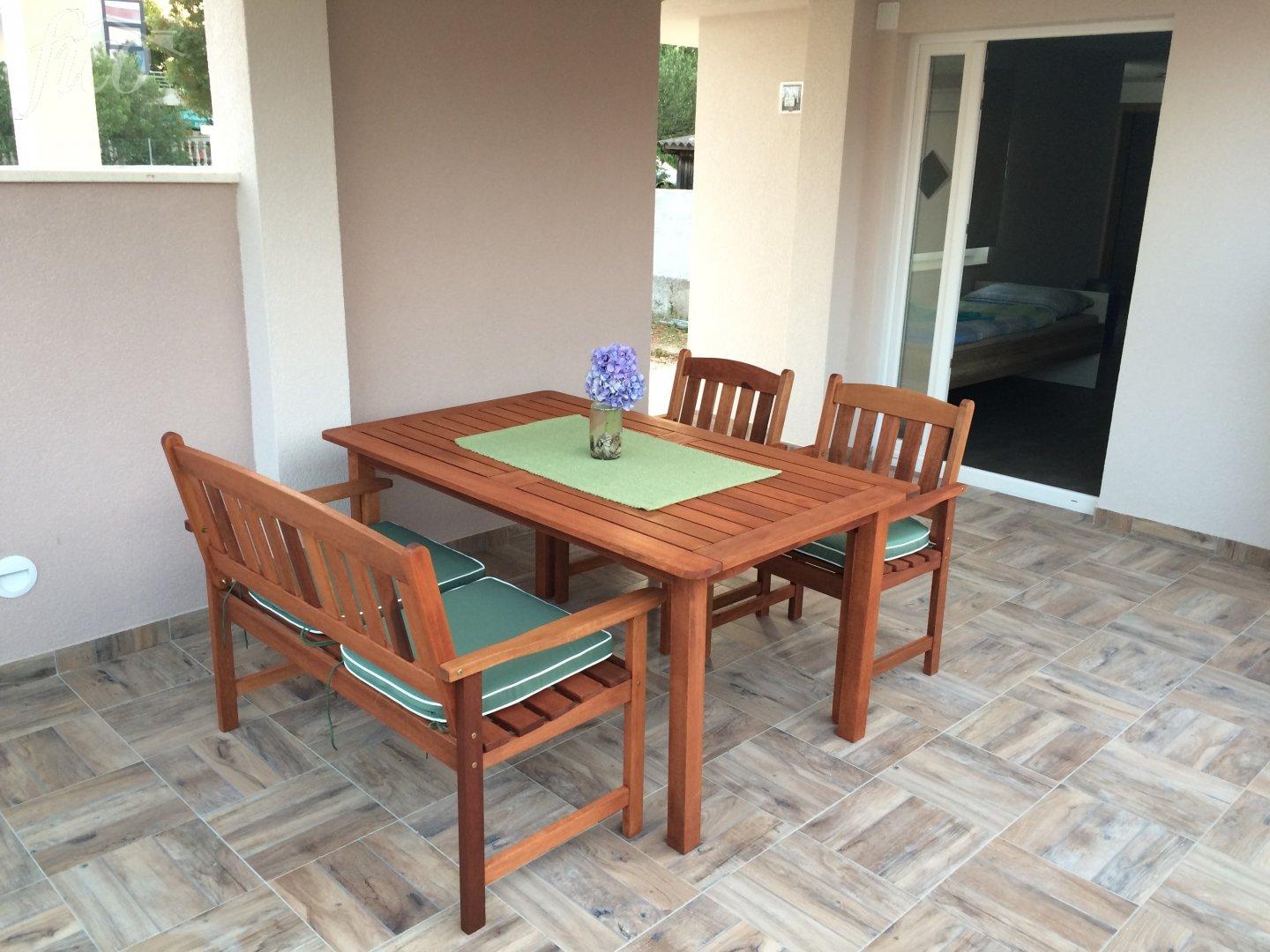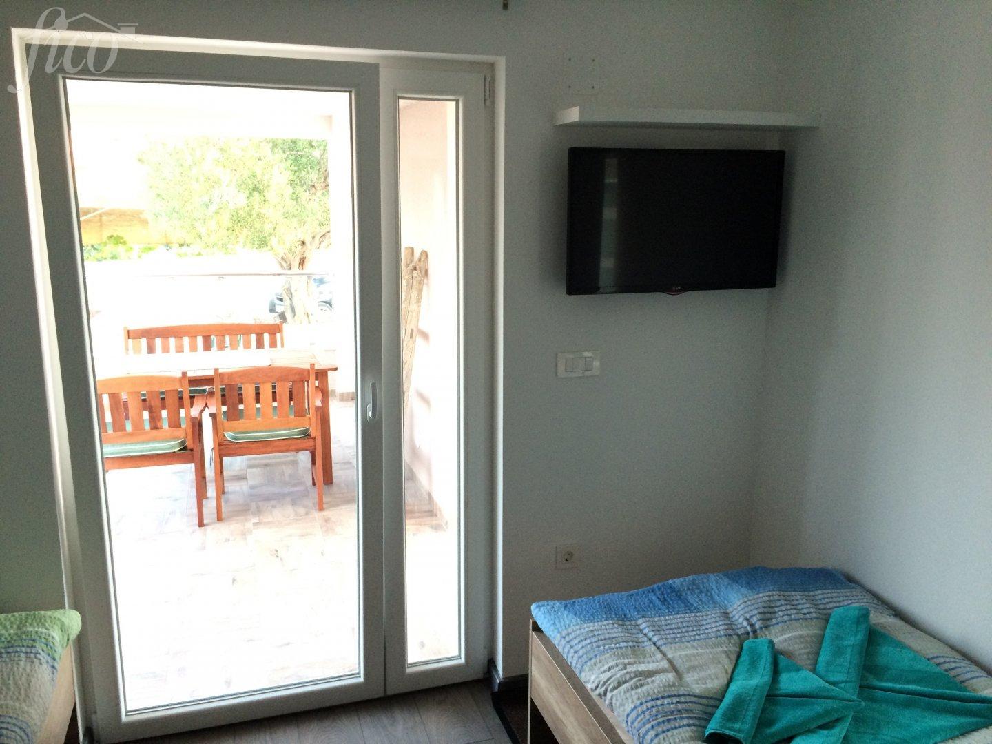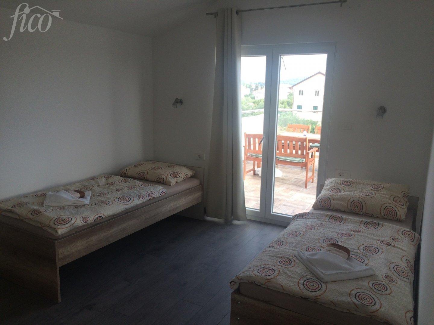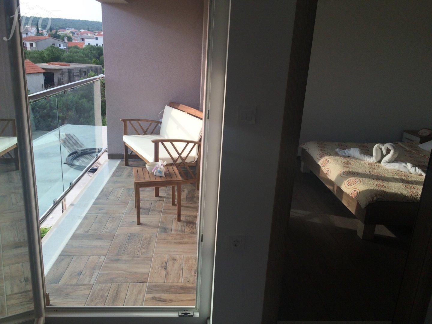 Apartmán v 1. patře se skládá ze 2 ložnic, jedna s manželskou postelí a druhá se dvěma samostatnými lůžky, které lze v případě potřeby propojit. Jeden pokoj má výstup na velkou krytou terasu a druhý na zastřešený balkon. Kuchyně s jídelním koutem má východ na druhou krytou terasu s výhledem na moře. Z obou teras je nádherný výhled na Rogoznici. Kuchyň je kompletně vybavená.