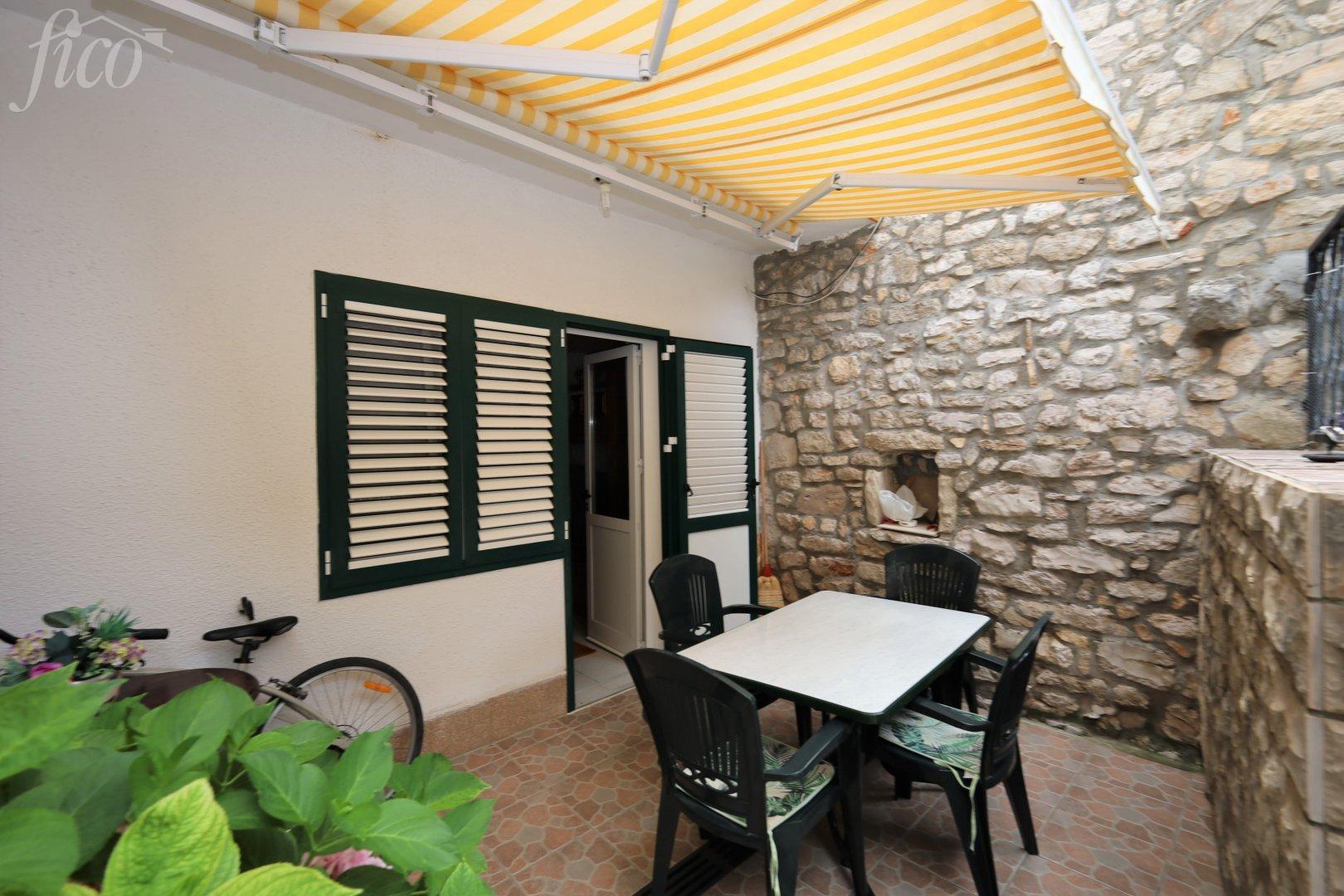 Renovovaný kamenný dům o třech podlažích ve staré části Tribunje, ve 2. řadě k moři. Dům má přízemí + 1. patro + 2. patro s celkovou užitnou plochou 141,23 m2 a přístup ze dvou ulic. Sestává z terasy, obývacího pokoje, chodby, kuchyně a jídelny, koupelny, komory a schodiště v přízemí, chodby, koupelny, dvou ložnic, terasy v 1. patře. Ve 2. patře jsou dvě terasy, jedna na jižní straně je kompletně zastřešená a druhá na západní straně je odkrytá. Dům je zařízen a ihned k nastěhování. Nachází na pěší zóně, autem je dojezd 20 m od domu, parkování je možné na nedalekém veřejném parkovišti.