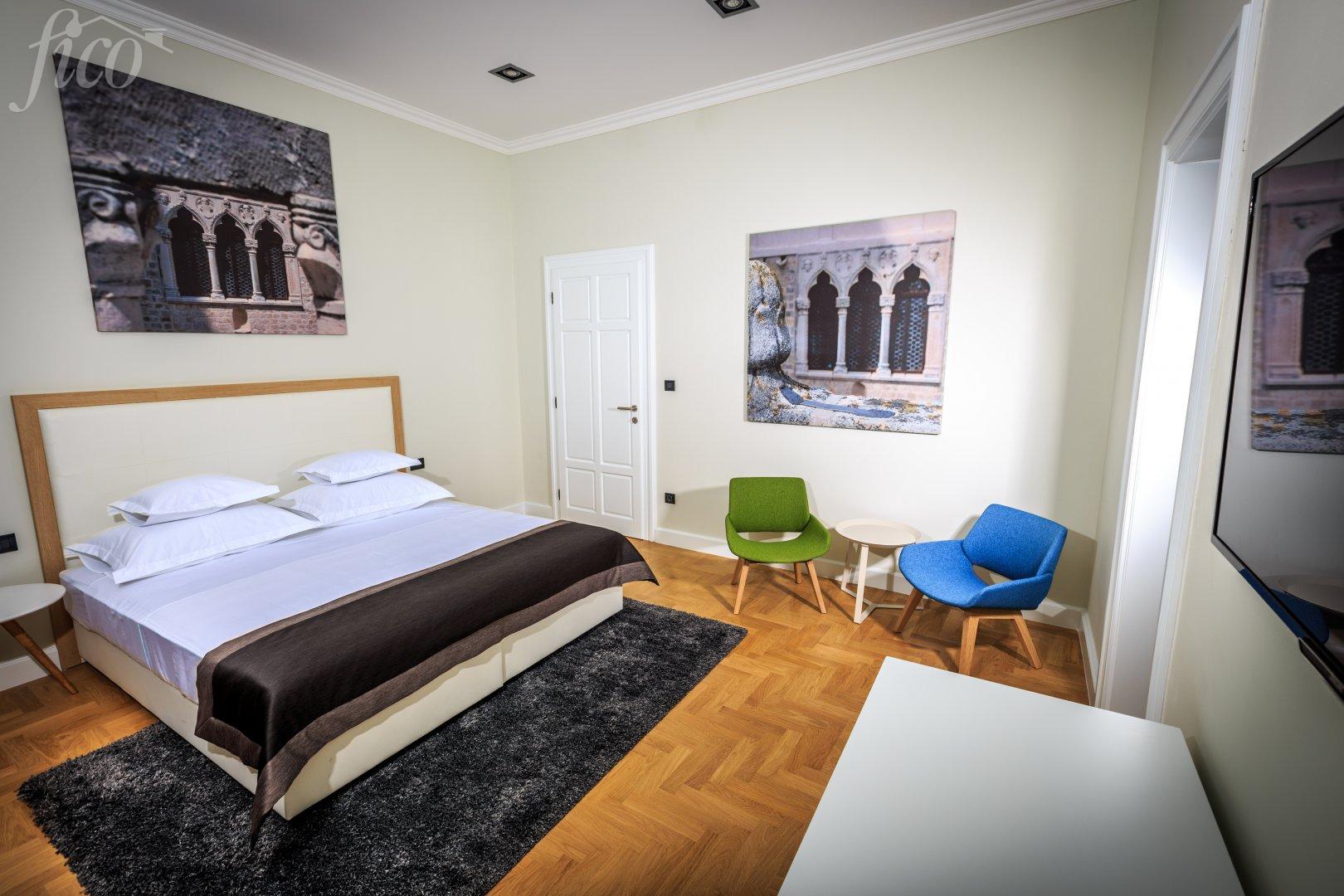 Rezidence se nachází v samém srdci starého města Trogir, malého ostrova, kdysi pevnosti, nyní známé jako „město muzeí“. Na hlavní náměstí a slavnou katedrálu sv. Vavřince to trvá jen pár kroků úzkými křivolakými uličkami plnými restaurací, barů a malých obchodů. Tato úžasná nemovitost se nachází ve druhém patře starého kamenného domu, který byl původně postaven (1928) pradědečkem majitele. Nyní je kompletně zrekonstruována s důrazem na estetiku a autentičnost. Rezidence nabízí 150 m2 obytné plochy, soukromou střešní terasu s lehátky, salonkem, vířivkou a 360stupňovým výhledem, 3 ložnice s manželskou postelí velikosti King, herna, pracovna, obývací pokoj, plně vybavená italská designová kuchyně, jídelna, dvě koupelny, oddělené WC. Nemovitost je kompetně zařízená vkusným, stylovým nábytkem.