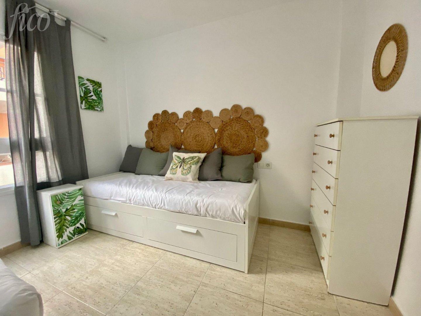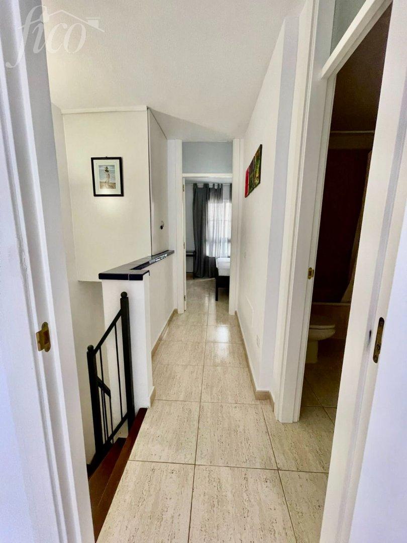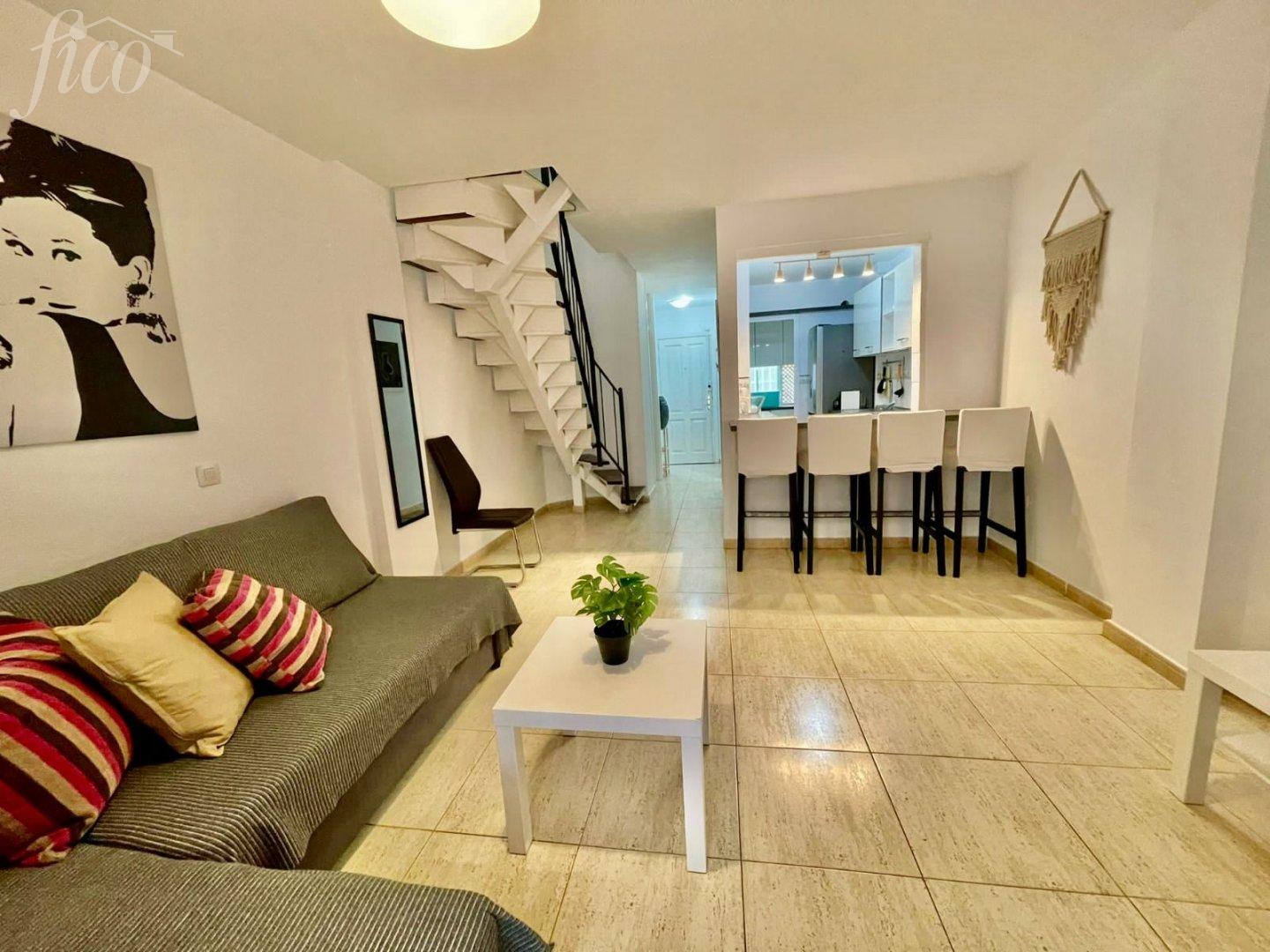 Mezonet na prodej v Callao Salvaje o výměře 84 m2. Velmi pěkný zařízený mezonet na prodej. V přízemí se nachází ve 2 podlažích kuchyň v moderním stylu, prostorný a světlý obývací pokoj s poměrně velkou terasou a 1 koupelna. Po schodech nahoru se dostanete do 2 velkých ložnic a hlavní koupelny. K bytu náleží také soukromé parkovací stání. Komplex s názvem Arcoiris má 2 bazény, zahrady, bezpečnostní kamery a 5 přístupů, z toho jeden přímo do moře "Playa de Ajabo". Komplex se nachází v nejlepší oblasti na jihu Tenerife, Costa Adeje. Má veřejnou dopravu, hřiště, obchody, restaurace, školu, pláž a promenádu do La Caleta. Lze pronajmout i za 1500 € měsíčně. Zastavěná plocha 84 m2, 51 m2 užitná plocha, zařízený, vestavěné skříně, zařízená kuchyně, komunitní bazén, společná zahrada, terasa.